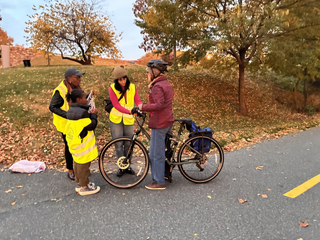 We handed out free front and rear lights to commuters biking by, food delivery workers, young people, and community members interested in learning more about how being seen improves safety. All together, we handed out 750 pairs of free bike lights – that’s 750 Philadelphians whose rides are now safer and more joyful — and 100 bike bells!
